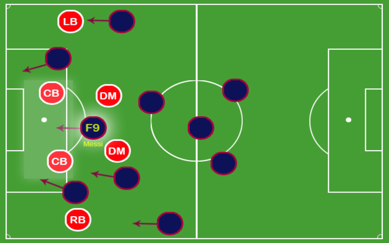 Trong hệ thống tiki-taka nổi tiếng của Barcelona, Messi thường xuyên lùi xuống giữa sân để phối hợp với các tiền vệ. Khi đó, các cầu thủ chạy cánh như Pedro hoặc David Villa sẽ tận dụng khoảng trống phía sau hàng phòng ngự để xâm nhập vòng cấm.
